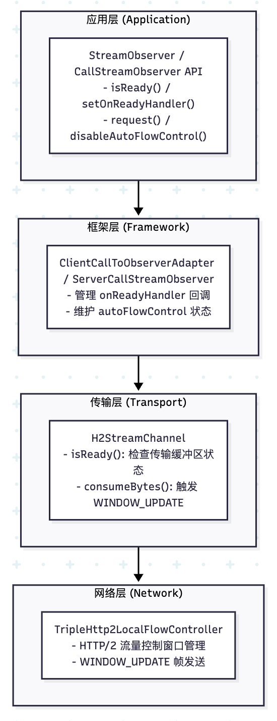 Triple 背压机制基于 HTTP/2 的流量控制能力实现,涉及以下几个层次: